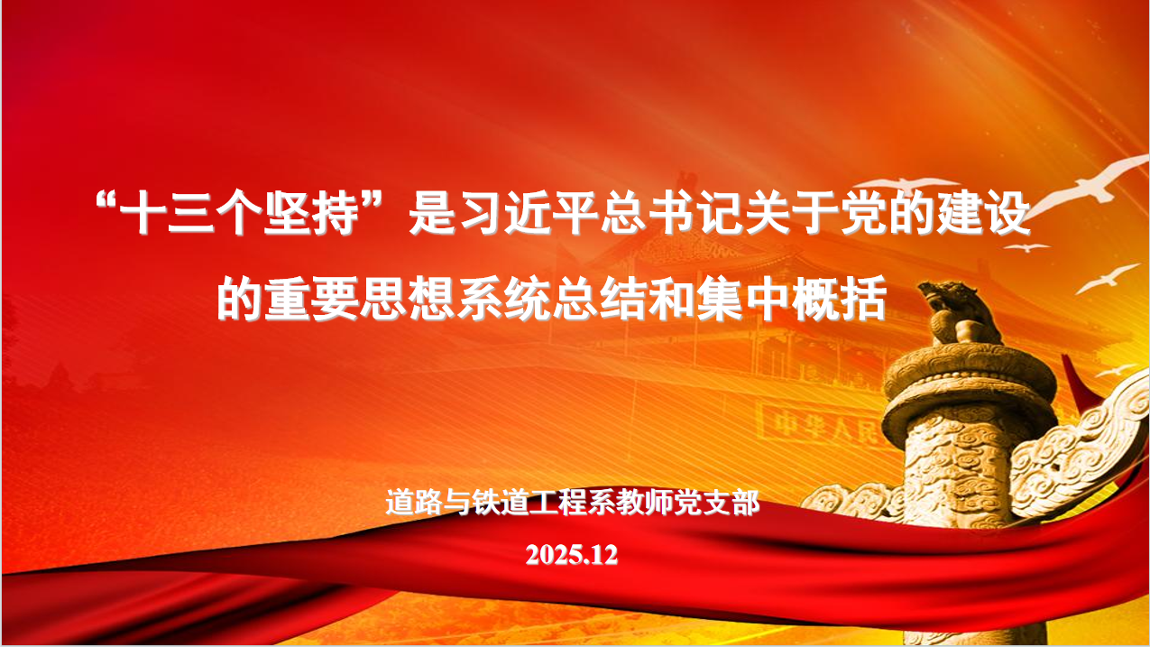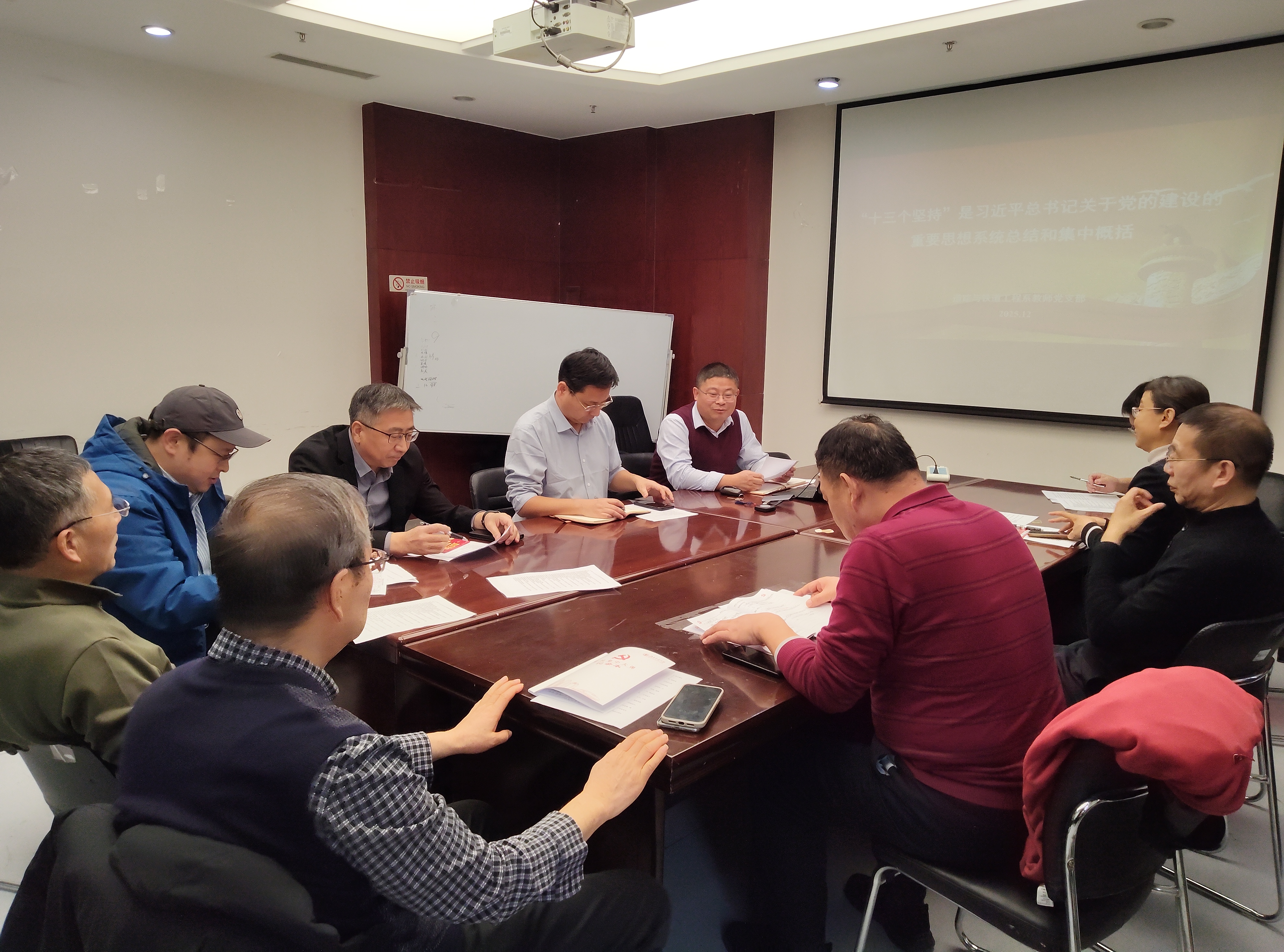 为深入学习领会习近平总书记关于党的建设的重要思想,切实把思想和行动统一到党中央决策部署上来,2025年12月11日13时,道铁系教师党支部在土木楼824会议室召开专题学习研讨会,围绕“为什么说‘十三个坚持’是习近平总书记关于党的建设的重要思想的系统总结和集中概括”开展深入交流。支部书记沈宇鹏同志主持会议,支部党员教师参加学习。