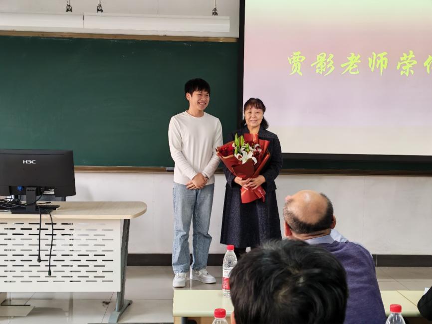 活动中,全体师生还为即将荣休的贾影老师举行了温馨的欢送仪式。员工代表阳云明向贾影老师献上鲜花。贾影老师回顾了自己三十七载从教生涯,分享了育人初心与执教感悟,言辞间充满对教育事业和学院师生的深厚感情。